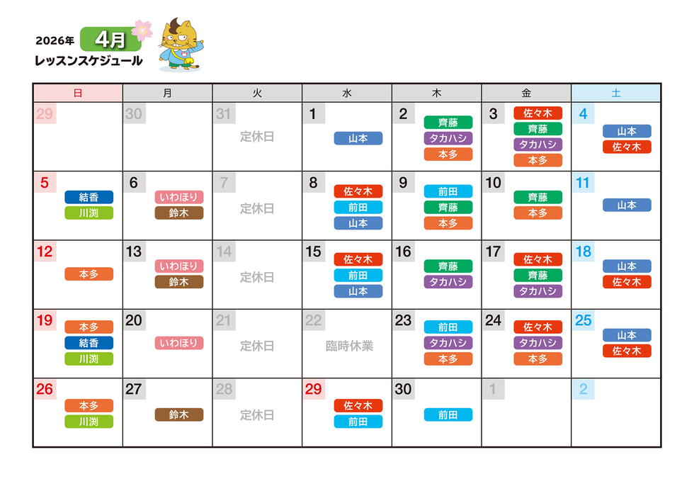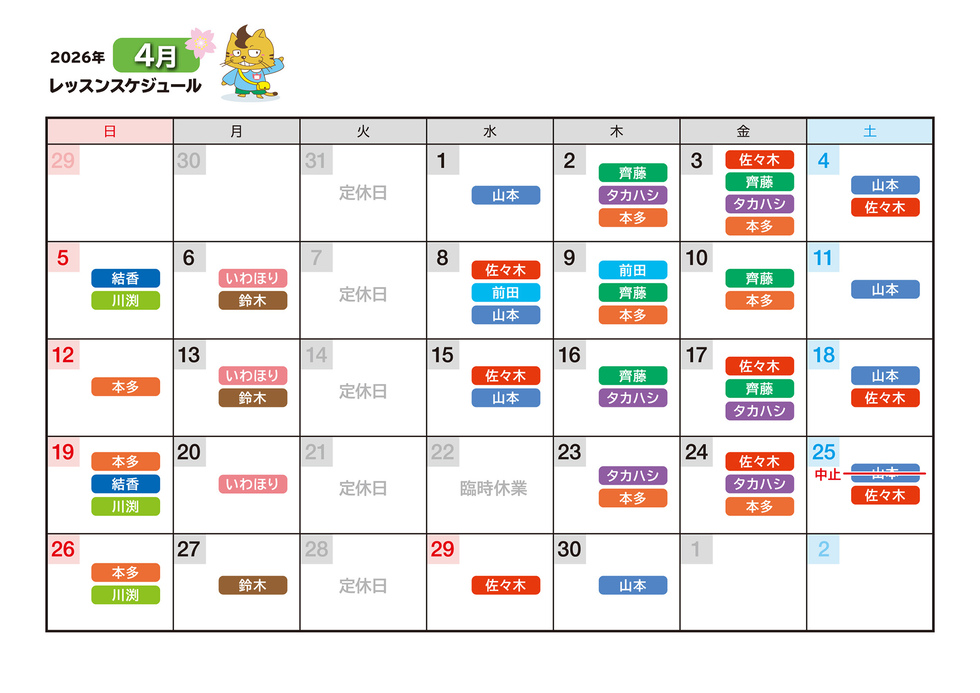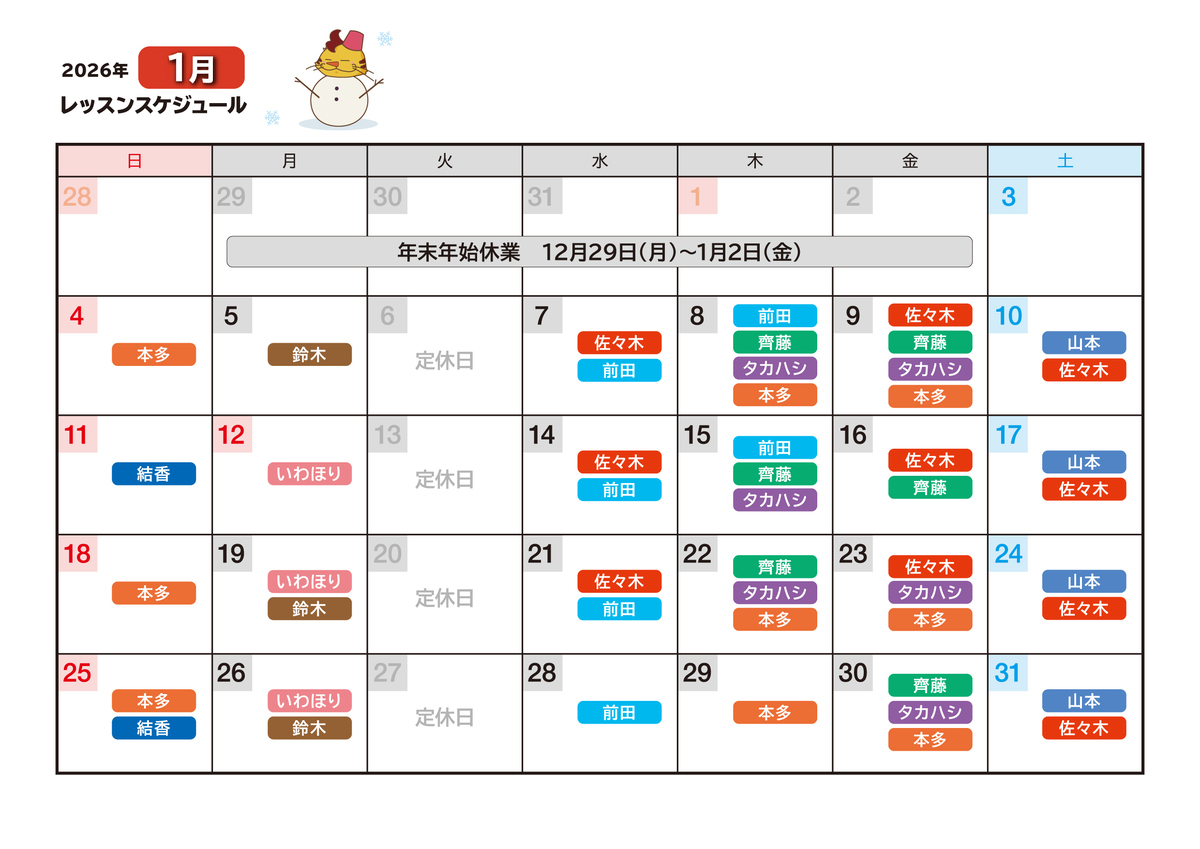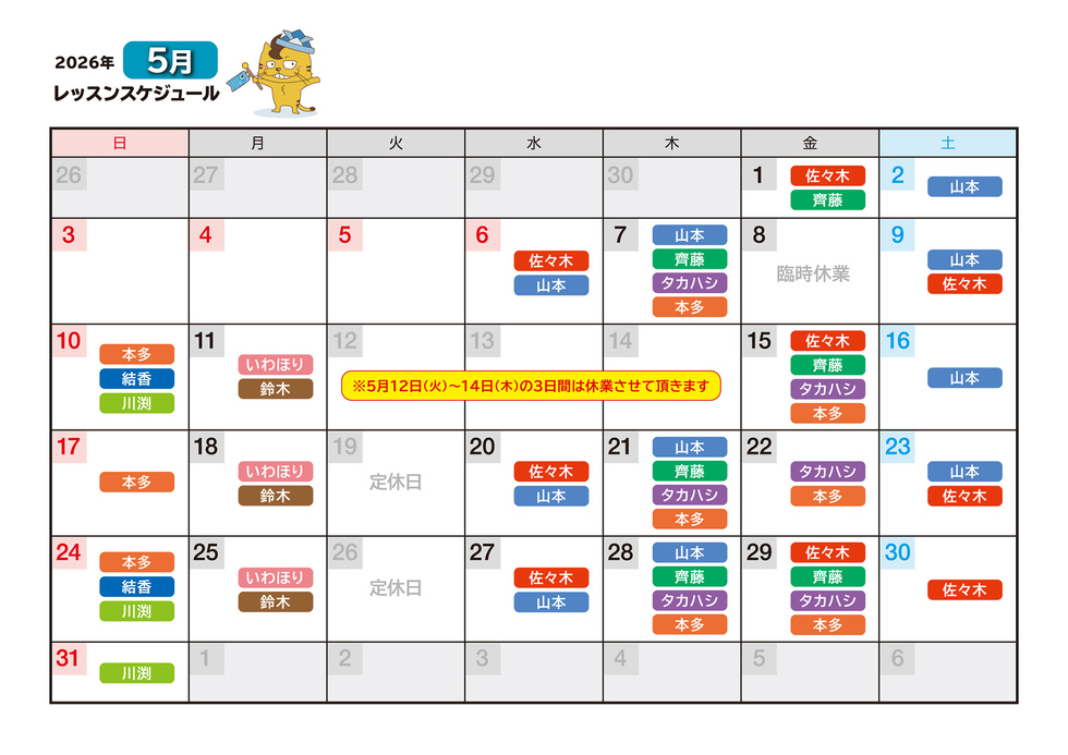 ※なお、講師の予定にないお休みに関しましては、補講日程をご提案させて頂きます。