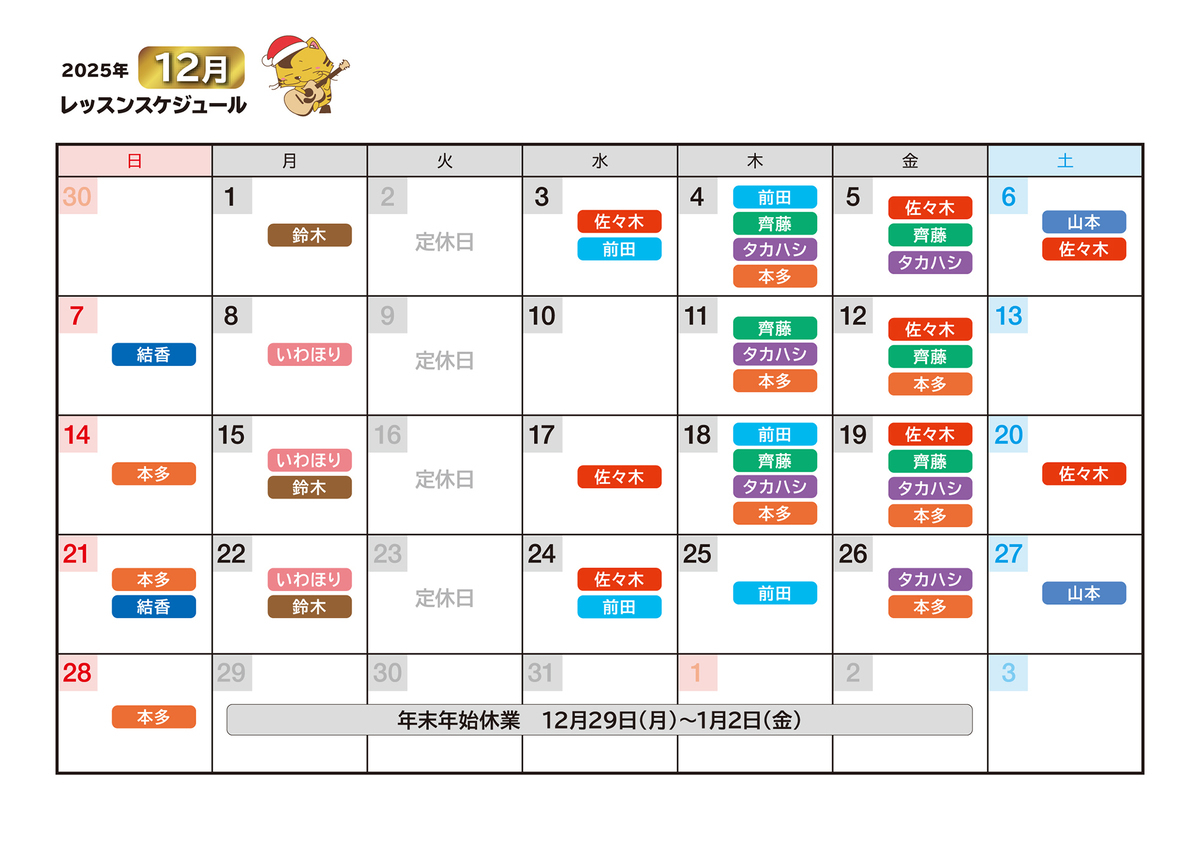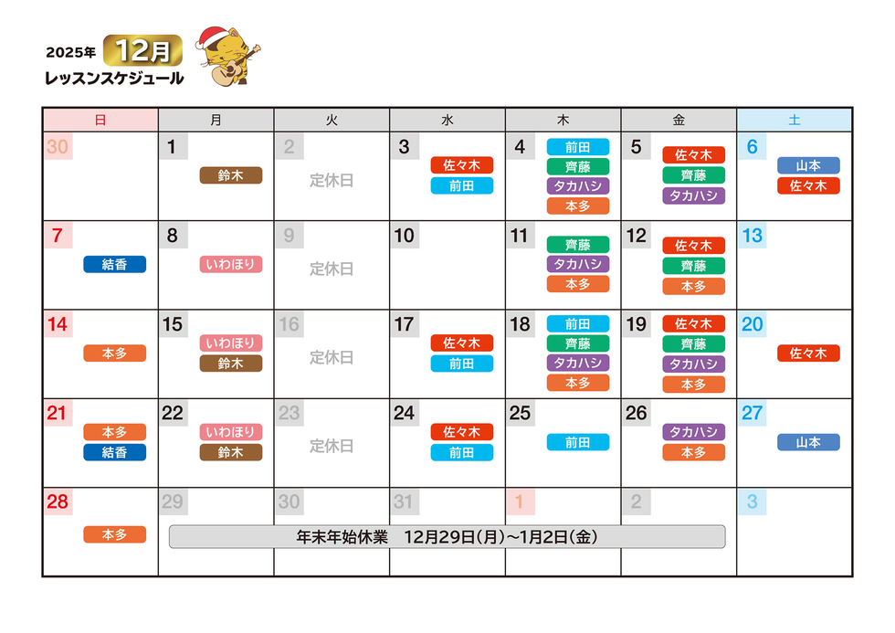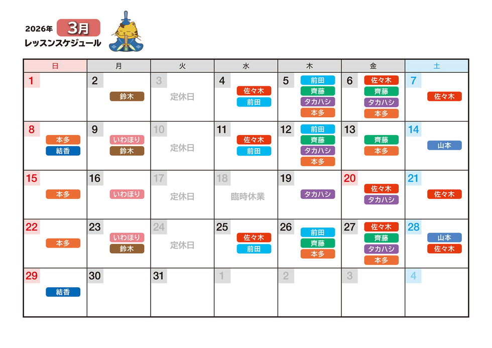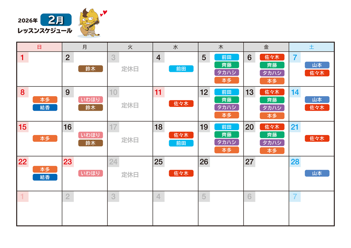※なお、講師の予定にないお休みに関しましては、補講日程をご提案させて頂きます。
